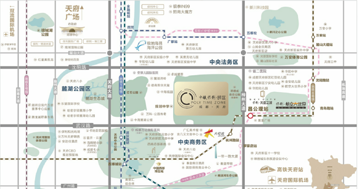 3 公里范围内享世界级商业配套,15 万方天府大悦城、20 万方天府国际保税商业中心、24 万方言几又国际文创中心,加上自身配套有 6.2 万方“绿魔方”商业,形成站城一体消费场所,打造天府黄金商业极核,丰富的商业配套。