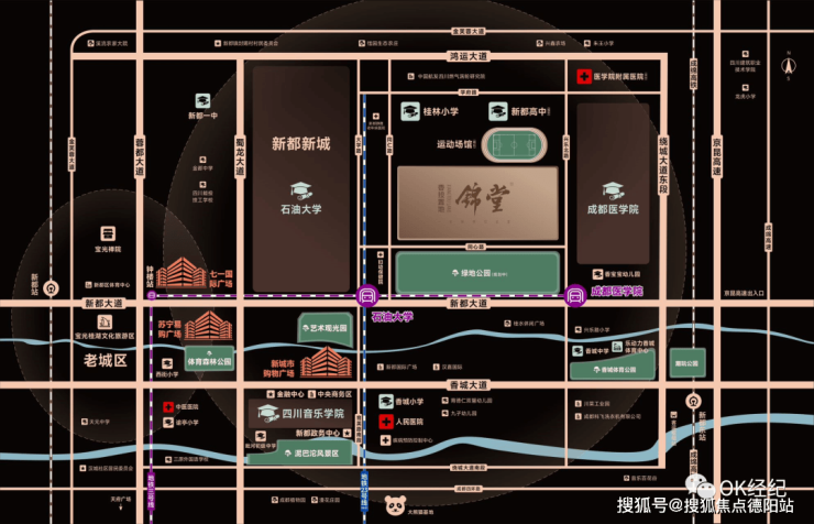 教育资源:全龄段名校锦簇,0-18岁的完善教育体系,香宝宝幼儿园、医学院附属小学、新都高中(拟建)、石油大学、医学院、音乐学院