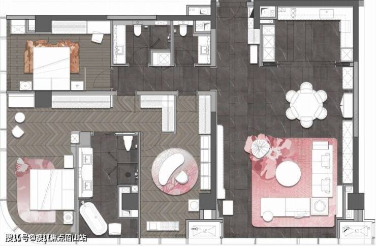 D户型居其——戴昆设计,汲取芙蓉花灵感,打造室内精装,在点题芙蓉花的基础上,突出与新国潮理念的融合,使之兼具现代与未来感,超250㎡的空间尺度体验。78㎡的宾利式餐客厅,68㎡的全景落地窗浪漫主卧。