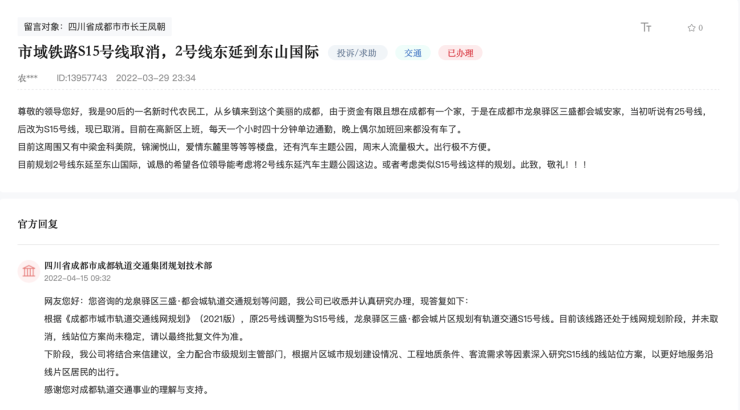 S15线是连接青白江欧洲产业城、龙泉驿区和天府新区的市域铁路线。龙泉驿区三盛·都会城片区规划有轨道交通S15号线,建成运营后可满足东麓城市民的出行需求