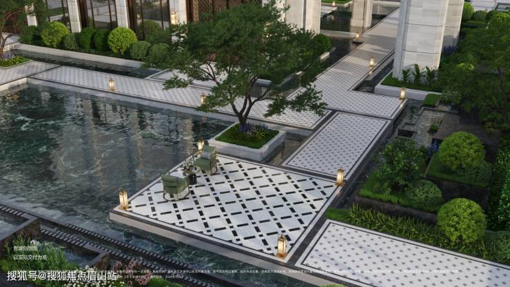 提取欧洲贵族的宫廷卷草纹,以全石材拼花铺装园林,精筑成都首例宫廷庄园式私家园囿;