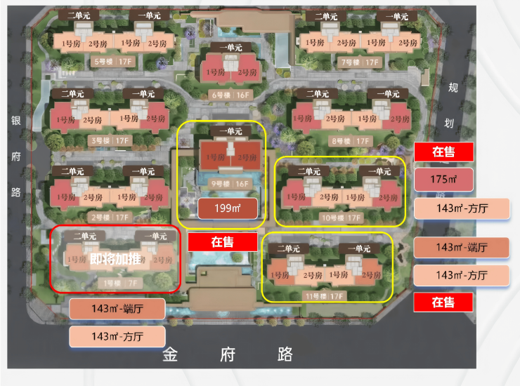 在售9#,10#,11#;即将加推:1#面积143㎡,预计单价3.8-4.1万,总价540万起