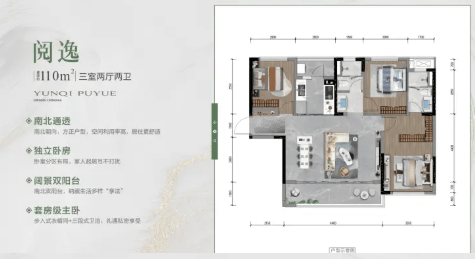 此户型强调居住的舒适性与私密性,采用南北通透格局。配备阔景双阳台,主卧为套房级设计,在保证家庭公共活动空间的同时,也照顾到了主人的私密尊享。