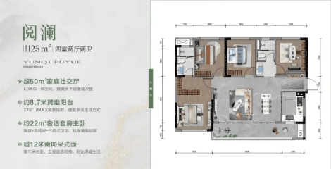 此户型专为多孩或与父母同住的改善家庭设计。核心亮点是超过50㎡的LDKG一体化家庭社交厅,连接8.7米跨维阳台,极大地拓展了家庭互动空间。主卧面积约22㎡,尺度奢适。