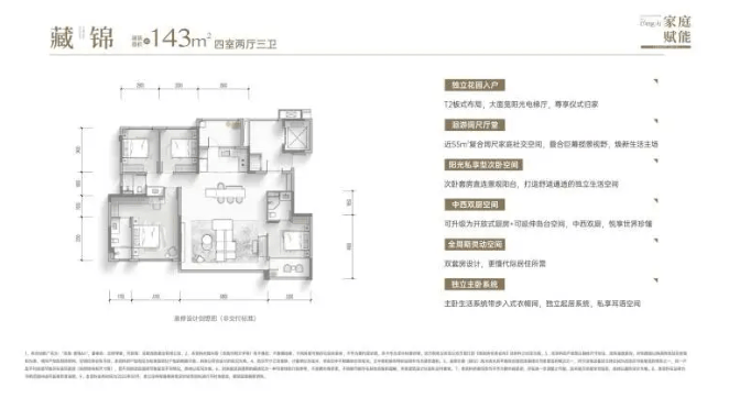 此户型为社区的尊享改善之作,采用四房三卫配置,并强调光厅入户的仪式感。空间大气宽敞,主卧套房尊崇感强,额外的卫生间极大提升了多代同堂或高频客访家庭的居住便利性与私密性,适合追求全面舒适体验的高端改善家庭。