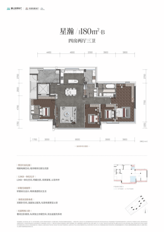 此户型为项目的旗舰产品,主打“奢阔尺度”。约180㎡的宽敞空间,为家庭生活提供了更从容的余裕。四房设计可轻松容纳多代同堂,并有余力规划独立书房、儿童活动区或多功能室。更大的客厅面宽与景观阳台,营造出恢弘的家居气度,是为追求终极改善、注重圈层与生活仪式感的城市菁英家庭定制的尊崇之选。