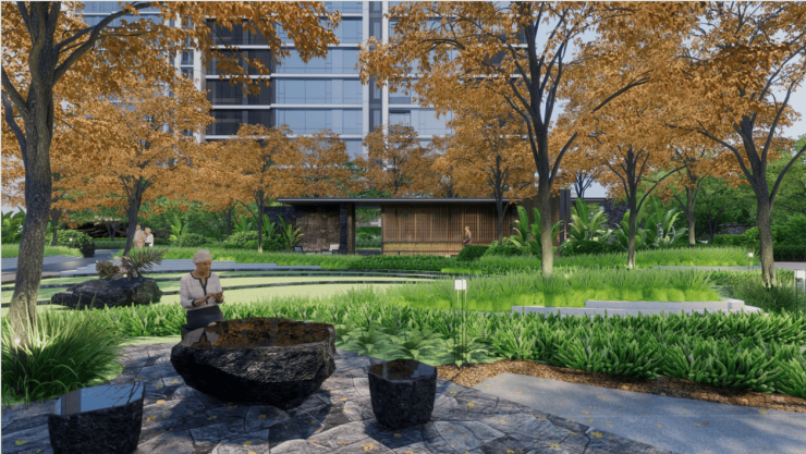 点 / 根植于生活的社交公园在招商时代公园,参与建筑间生长的点状公园。首先,充分利用城市土地间的“金角银边”规划社交场景公园,让公园城市更具社交属性;其次,充分注重住宅及产业园区内的园林打造,让宅间公园根植于生活肌理。