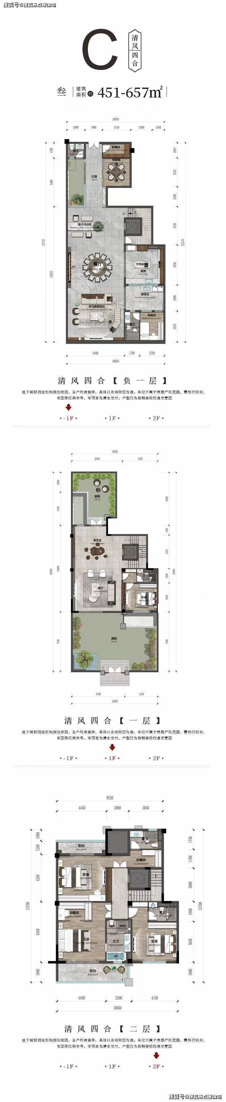 项目的建筑构型,创造性地设计了3户式品字形结构。传统的叠拼别墅,除了下叠户型拥有院落外,上叠户型仅仅只有露台(中叠户型没有户外空间)。而院落是衡量“墅居”舒适度的首要标准。本项目独特的建筑结构,直接舍弃了中叠户型,换来了珍贵的“院落”空间,牺牲了大量的可售建筑面积,使得下叠户型和上叠户型均有“大尺度”的亲地院落。