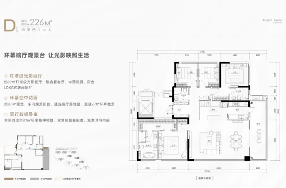 项目主力产品为建面约143-226㎡的全系四房精装大平层,均采用LDKG一体式方厅设计,面向改善家庭,强调空间互动与公园景观的深度融合。