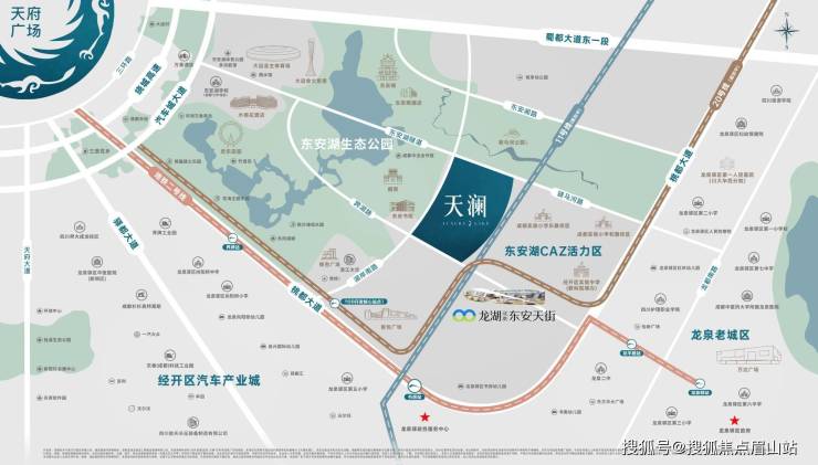 【2⃣ 东安湖高端生活主场,南岸中央CAZ活力区】项目北揽5000亩东安湖生态,南拥龙泉驿区约20万方最大商业 综合体——龙湖东安天街+吾悦广场,兼具静谧生态与繁华商圈,汇聚东安湖最好的配套资源