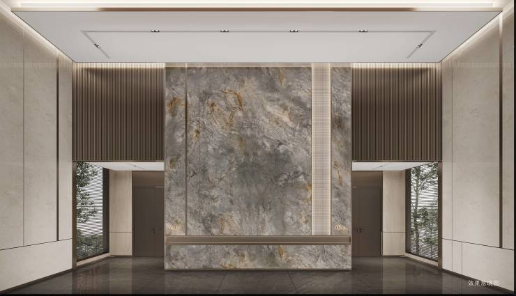 ◎1F豪华楼宇大堂奢华酒店精装风格|约10M宽、5.6M挑高|大规格岩板背景墙|艺术玻璃及金属内嵌设计|悬浮吊顶辅以金属包边