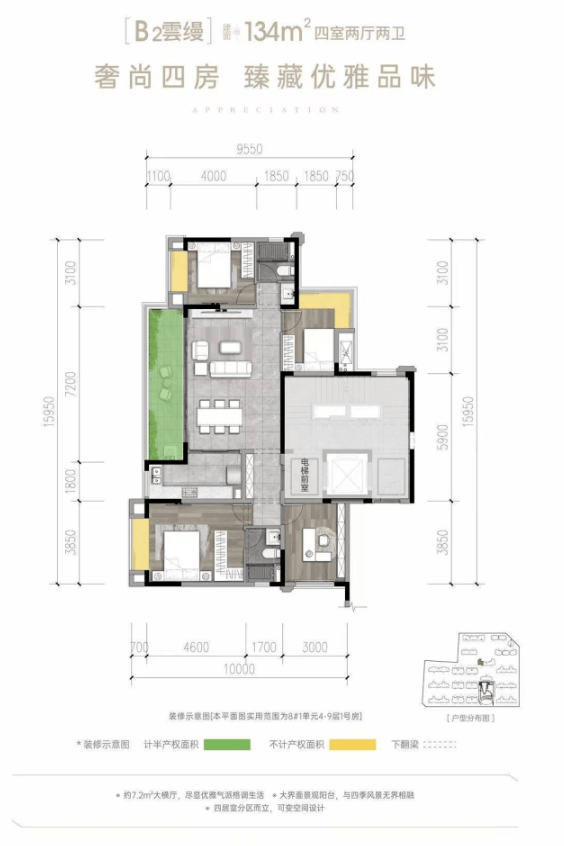 此系产品为社区的高端改善之作,分布于11层的纯洋房楼栋,采用1梯2户的尊享配置。四房两厅的格局更为宽松,主卧多设计为套房,居住私密性与舒适度更高。作为洋房产品,其得房率、社区静谧度及圈层纯粹性都更具优势,是追求一步到位改善家庭的理想选择。