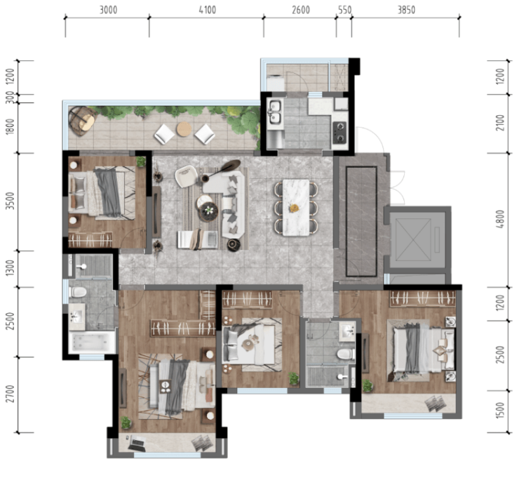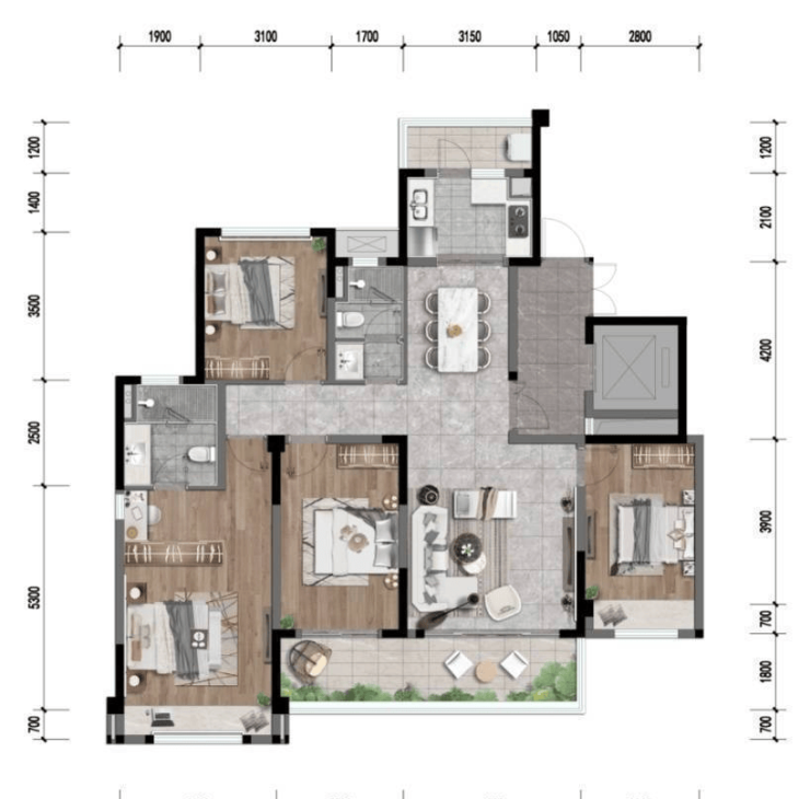 177㎡套四双卫户型【板式大平层】·【大横厅,观景佳,采光足】·【俯瞰超长中轴景观带】·【私梯入户,前室独享】·【双卫生间干湿分离】·【独立套房,带飘窗】·【明厨明卫全采光】