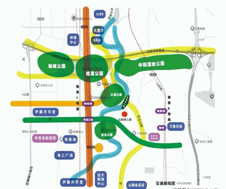 环抱三大公园:桂溪生态公园(1400亩)、锦城湖公园(2400亩)、中和湿地公园(3000亩)