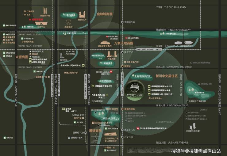 ▍繁华天赋之地 三大醇熟商圈约3KM内新川潮奢生活圈:西南首个万象天地(建设中)、文艺潮流MALL明日巴适、蓝润置地广场、远大购物中心等,畅享24H生活场景;约7KM内金融城商圈、环球商圈:银泰IN99、悠方购物中心、仁和新城购物中心、环球中心、SKP等,万象缤纷生活。