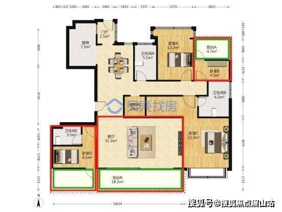 左下方卧室配置了卫生间,但面积却只有8.1平米,很显然装修时也会包阳台。