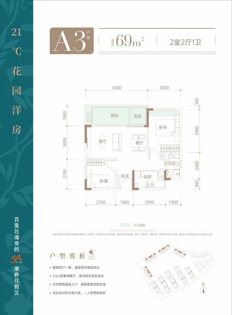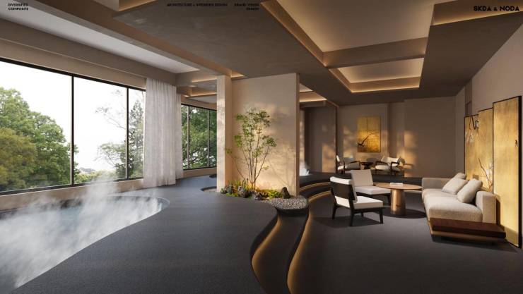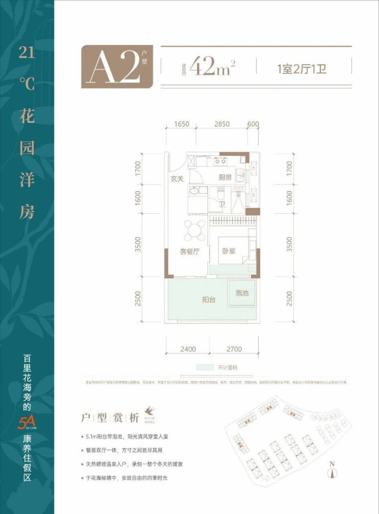 物业涵盖洋房 2.5 元 /㎡・月、叠拼 3.5 元 /㎡・月、合院 5 元 /㎡・月,产品定位为集避暑、康养、度假为一体的低密生态住区,户户精装带地暖,天然锶锂温泉私汤家家入户。