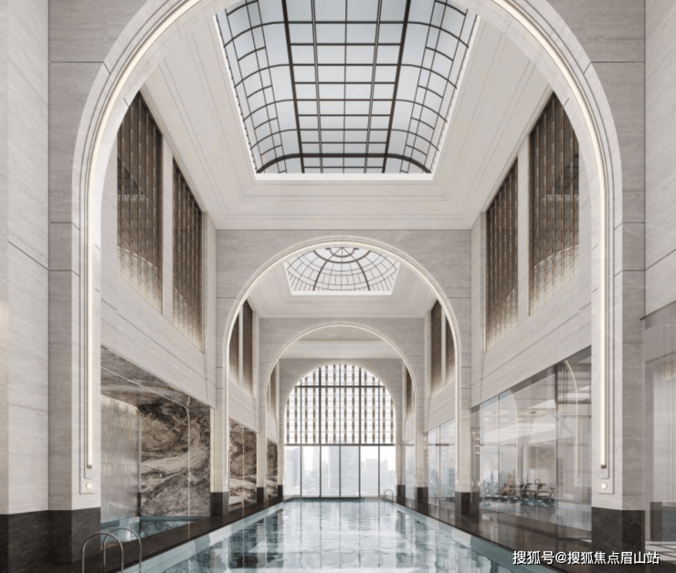 项目复刻其经典装饰主义,约10m挑高大堂,挑空拱门架构的恒温泳池、孔雀廊般的艺术展廊,层叠线条,艺术家真品装置等,让峯层生活从此同频华尔道夫