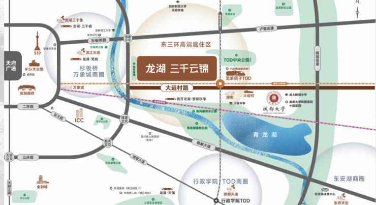 【区域——主城稀缺,东三环最后居住贵地】等线纵观三环,南有金融城、神仙树,西聚武侯新城、光华、金沙等西贵社区,北有华侨城、昭觉寺、北湖住区,南、西、北三环区域逐渐饱和,唯东三环仅留可供开发珍土,且东三环拥有城市繁华,更有东风渠天然资源青龙湖湿地公园,是三环最后珍藏的价值洼地。