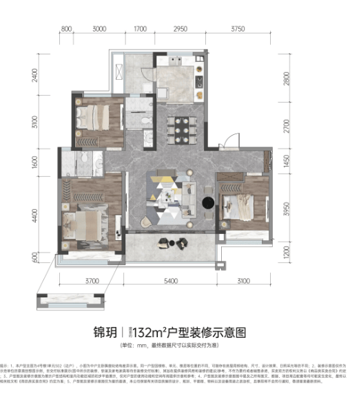 建面约132㎡三房户型