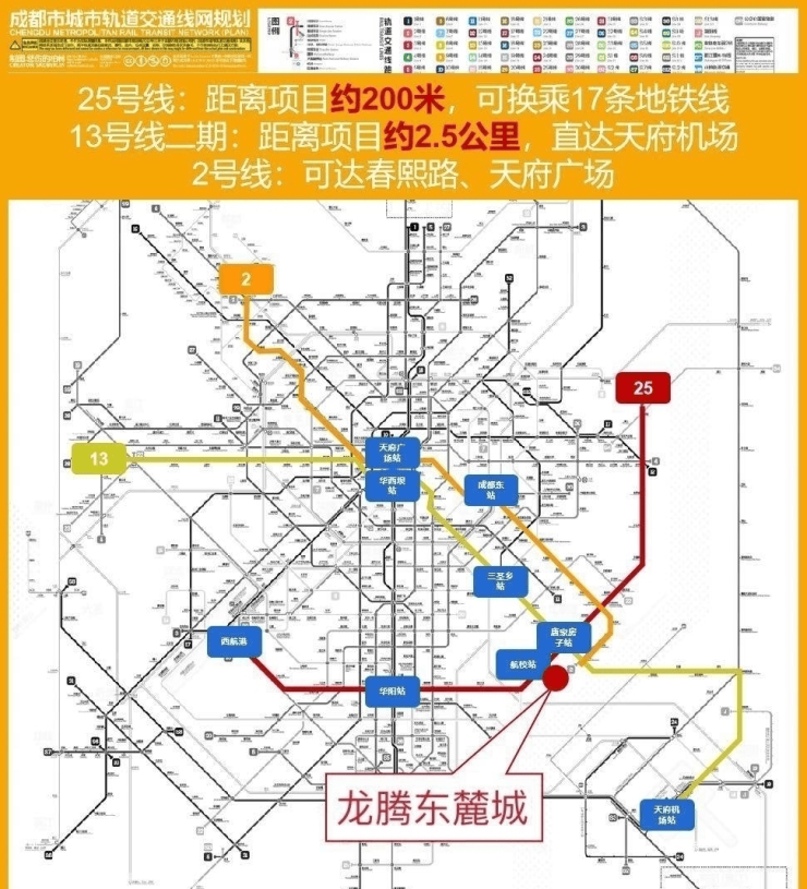 两横一纵路网 通达城市全域成龙大道(成简快速路)、天府机场高速、五环路(2023年全线通车);地铁2号线、13号线(在建)、市域铁路S13线、S15线等轨道交通;851、571等十余条公交线路覆盖。