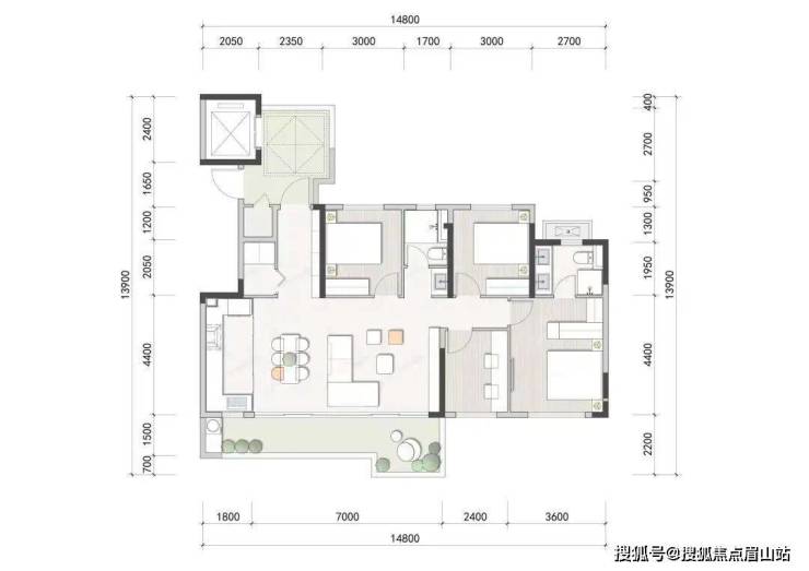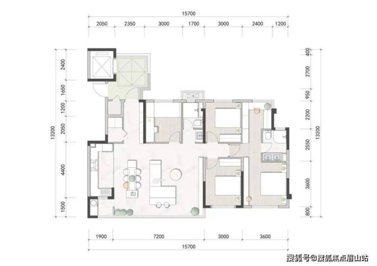 第三,整个户型,在同面积段,比如105㎡的三房双卫,它的面宽要排到市面上前三,通透性要保证。