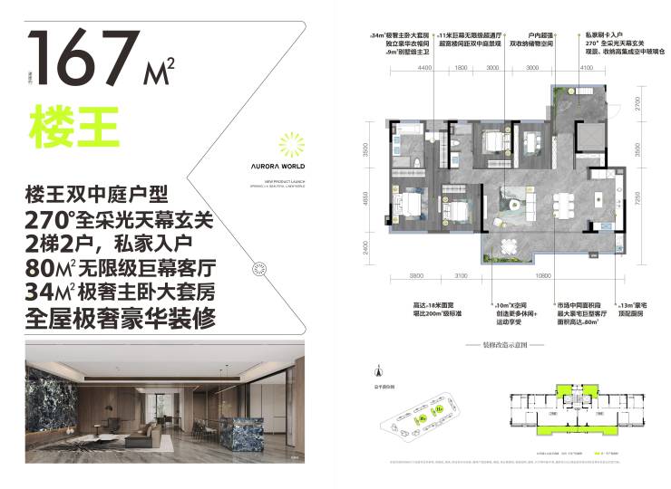 【167㎡四房-楼王双中庭户型】270°全采光天幕玄关,1梯1户,私家入户80M²无限级巨幕客厅,34㎡极奢主卧大套房,全屋极奢豪华装修(4号地块10、11栋)