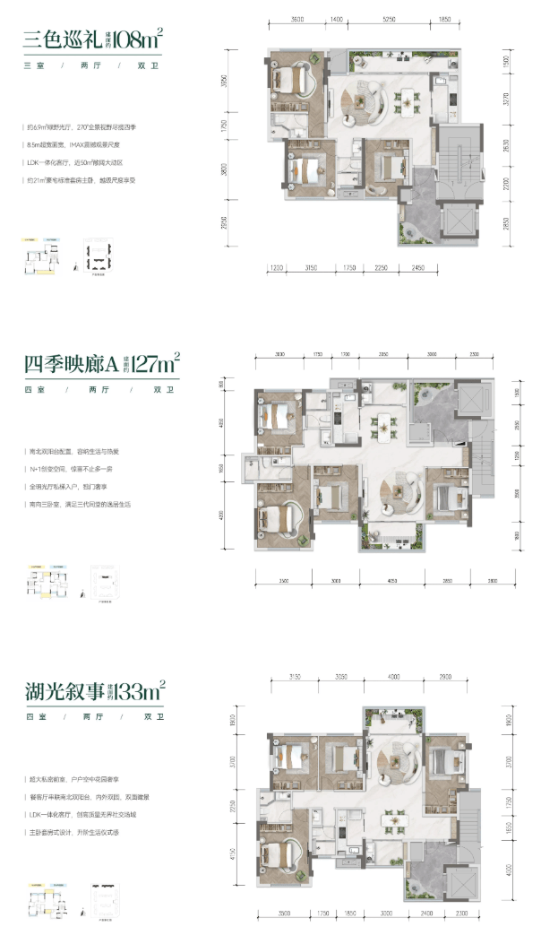 户型覆盖 108-133㎡,均为精装交付,省去装修烦恼,实现 “拎包入住”;