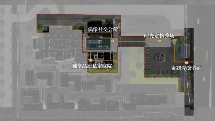 项目景观延续建筑设计语言,提取“交子”元素演绎场景符号,打造精奢、定制社交场景。将示范区分为“超级精奢界面”、“时光定格秀场”和“偶像社交会所”三大部分。
