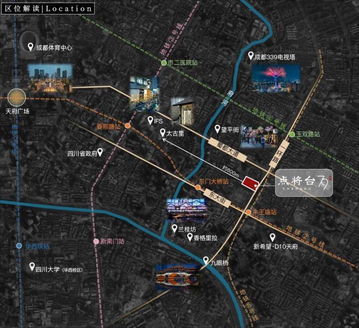 项目位于成都市区一环内,紧邻太古里,直线约3公里范围内拥抱兰桂坊、九眼桥等城市地标,所在区域更是第一张纸币“交子”的诞生地,历史底蕴深厚。