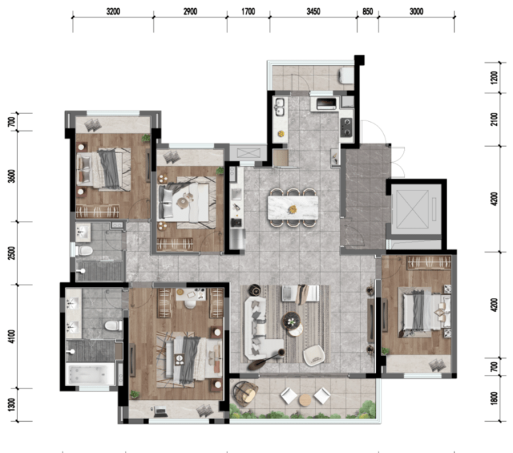 177㎡套四双卫户型【板式大平层】·【大横厅,观景佳,采光足】·【俯瞰超长中轴景观带】·【私梯入户,前室独享】·【双卫生间干湿分离】·【独立套房,带飘窗】·【明厨明卫全采光】
