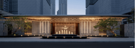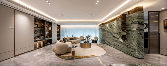 海浪纹样顶饰,奢石为壁叠泉相迎,门外是显贵身份的面子,门内是隐奢生活的里子。